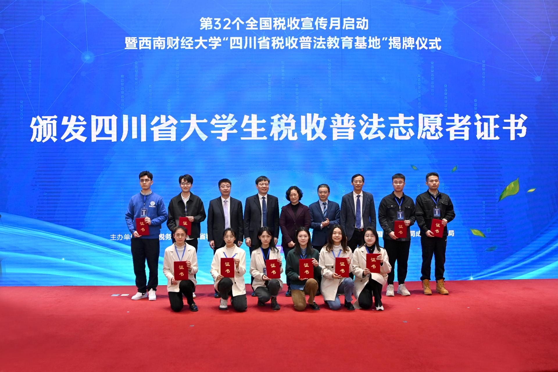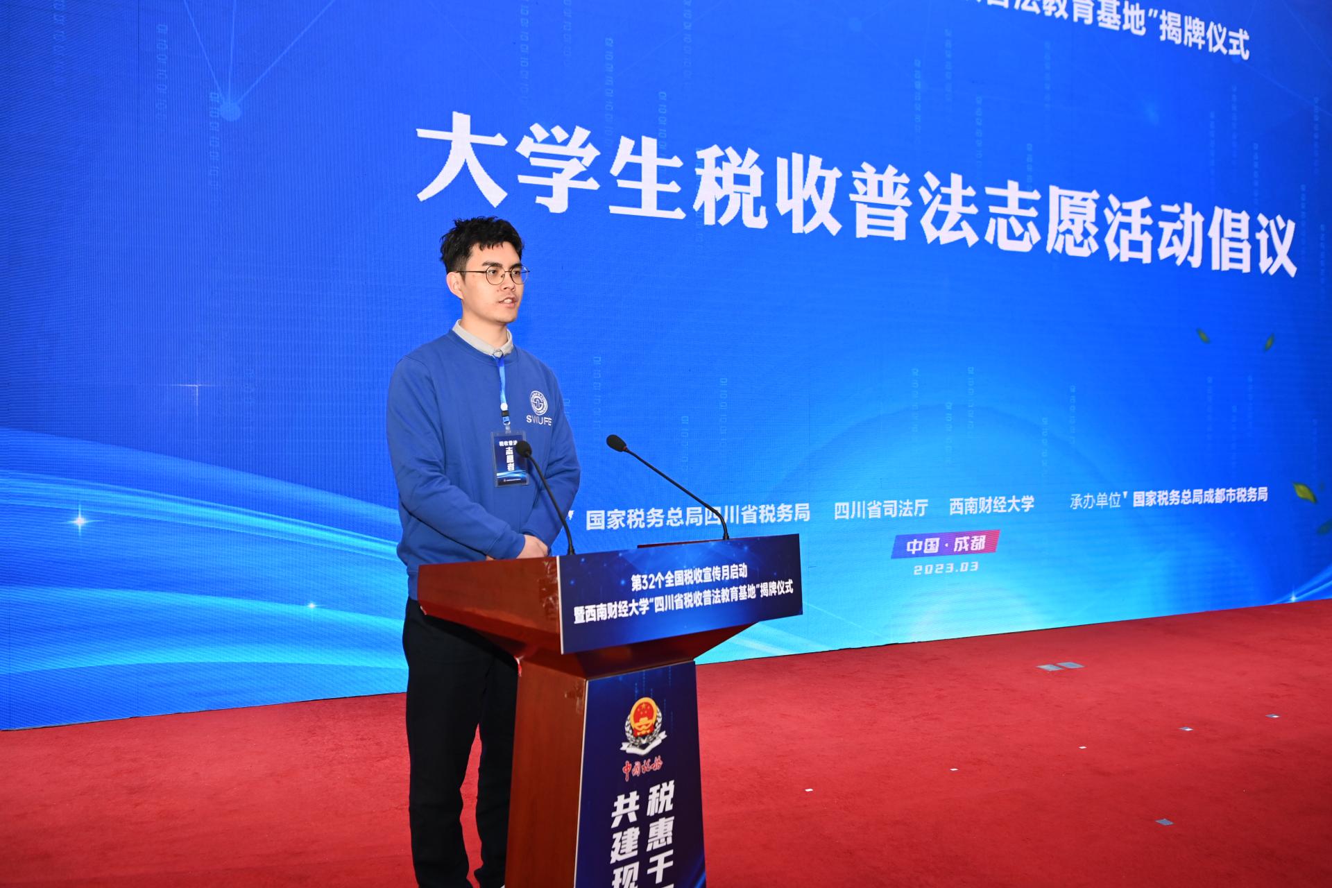 儀式上,李杰與卓志共同為四川省稅收普法教育基地揭牌,與會領導為大學生稅收普法志愿者頒發證書,激勵大學生強化稅收意識,樹立稅收法治觀念。我校財政學專業學子代表四川大學生稅收普法志愿者發起倡議,將攜手共進、勠力同心,倡導誠信納稅理念,爭當稅收普法“宣傳者”、誠信納稅“倡導者”、稅收共治“參與者”。