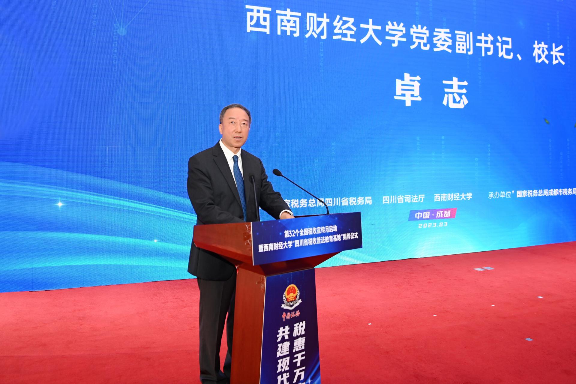 3月30日,第32個全國稅收宣傳月啟動暨“四川省稅收普法教育基地”揭牌儀式在我校舉行,以“稅惠千萬家 共建現代化”為主題的稅收宣傳月活動正式啟動。四川省稅務局黨委書記、局長李杰,四川省司法廳二級巡視員王勤,四川省稅務局黨委副書記、成都市稅務局黨委書記、局長李杰生,四川省稅務局黨委委員、總經濟師白冰;我校黨委副書記、校長卓志,黨委副書記馬驍,黨委常委、副校長桂富強出席儀式。