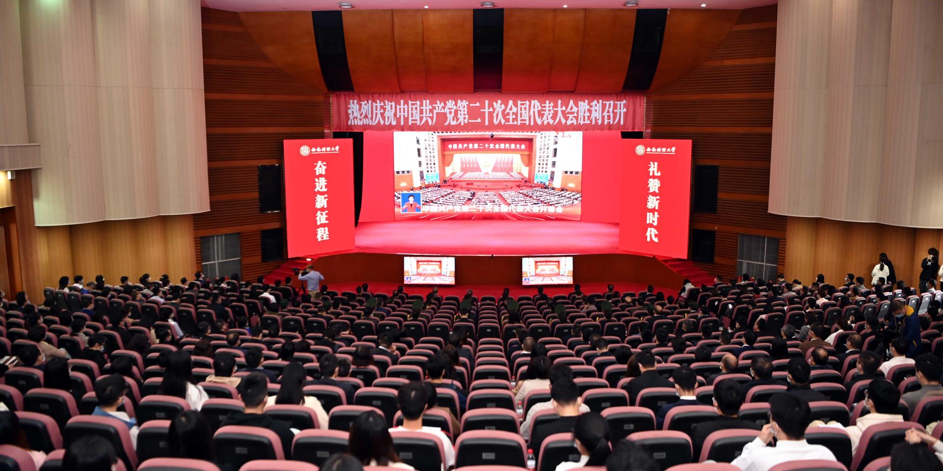 把迎接學習宣傳貫徹黨的二十大作為主題主線,聚焦六項重點任務,扎實開展迎接學習宣傳黨的二十大專項行動,引導全校師生同心向黨迎盛會、踔厲奮發謀新篇。組織2萬余名師生在兩校區主會場、90余個分會場和食堂教室、辦公居住地等多途徑多形式收看黨的二十大開幕會盛況。第一時間召開黨委常委會(擴大)會議,傳達學習黨的二十大精神,研究制定學習宣傳貫徹黨的二十大精神的實施意見,作出“五個全面落實、十個聚焦問題”工作部署。迅速召開傳達學習大會,全校上下通過校院兩級理論中心組學習、“三會一課”、教職工政治理論學習等形式開展全面系統學習。組建師生宣講團深入宣講巡講;召開專家學者、青年教師、統一戰線、離退休教師、青年學生座談會交流研討;開展集體備課、編寫教材講義,扎實推動黨的二十大精神“三進”全覆蓋。啟動“研究闡釋黨的二十大精神重大專項”招標,策劃“中國式現代化系列研究報告”,《經濟學家》《財經科學》開辟專欄。推出十篇《“中國這十年·教育這十年”西財篇章》專題報道。召開中國共產黨西南財經大學第十三屆代表大會第五次會議,制定《關于深入學習貫徹黨的二十大精神全面推進“新財經”戰略升級加快建設財經特色鮮明的世界一流大學的決定》,全面落實科教興國戰略部署,著力推進一流學科培優、財經科技創新、人才引領支撐,在新征程上奮力譜寫學校高質量發展新篇章。