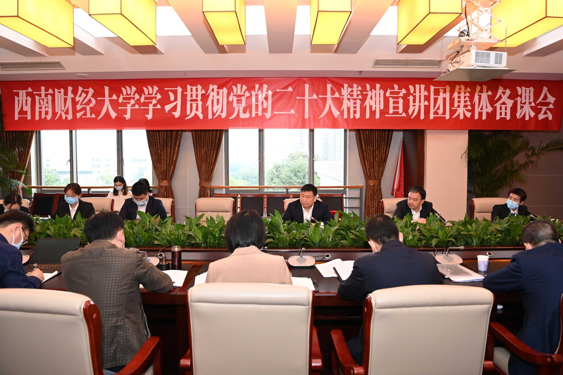 趙德武強調,要緊扣大會精神講,講好思想偉力、講好使命任務,深入落實“七個講清楚”要求,原原本本學習,原汁原味宣講,著重講深講透黨的創新理論的道理學理哲理和以中國式現代化全面推進中華民族偉大復興的戰略部署,引導全校師生深刻領悟“兩個確立”的決定性意義,增強“四個意識”、堅定“四個自信”、做到“兩個維護”,增強敢于斗爭的志氣、骨氣、底氣。要聯系教育事業講,講好教育使命、講好教育情懷,深入宣講黨的二十大關于科教興國戰略部署,講清講透教育、科技、人才對于全面建設社會主義現代化國家的基礎性、戰略性支撐作用,引導全校師生切實提高政治站位,不斷增強政治判斷力、政治領悟力、政治執行力,有力回答好“強國建設中教育何為、西財何為”的重大命題。要結合學校發展講,講好西財部署、講好西財作為,深入宣講學校全面落實“五個牢牢把握”重要要求的決策部署,引導全校師生把理論學習與研究謀劃事關學校發展全局的“十個聚焦”重大問題有機結合起來,為學校加快建設財經特色鮮明的世界一流大學奠定堅實思想基礎,為全面建設社會主義現代化國家、全面推進中華民族偉大復興貢獻西財力量。要扛起政治責任講,講出實際成效、講出奮進力量,以高度的政治責任感和歷史使命感扎實開展宣講工作,把握正確導向、增強宣講實效、突出以講促研、加強統籌協調,深入學習、周密安排、精心備課,讓全校師生被偉大真理的力量所感召,被自信自強、守正創新的信念所激勵,被踔厲奮發、勇毅前行的精神所感染,凝聚起萬眾一心、攻堅克難的磅礴力量。