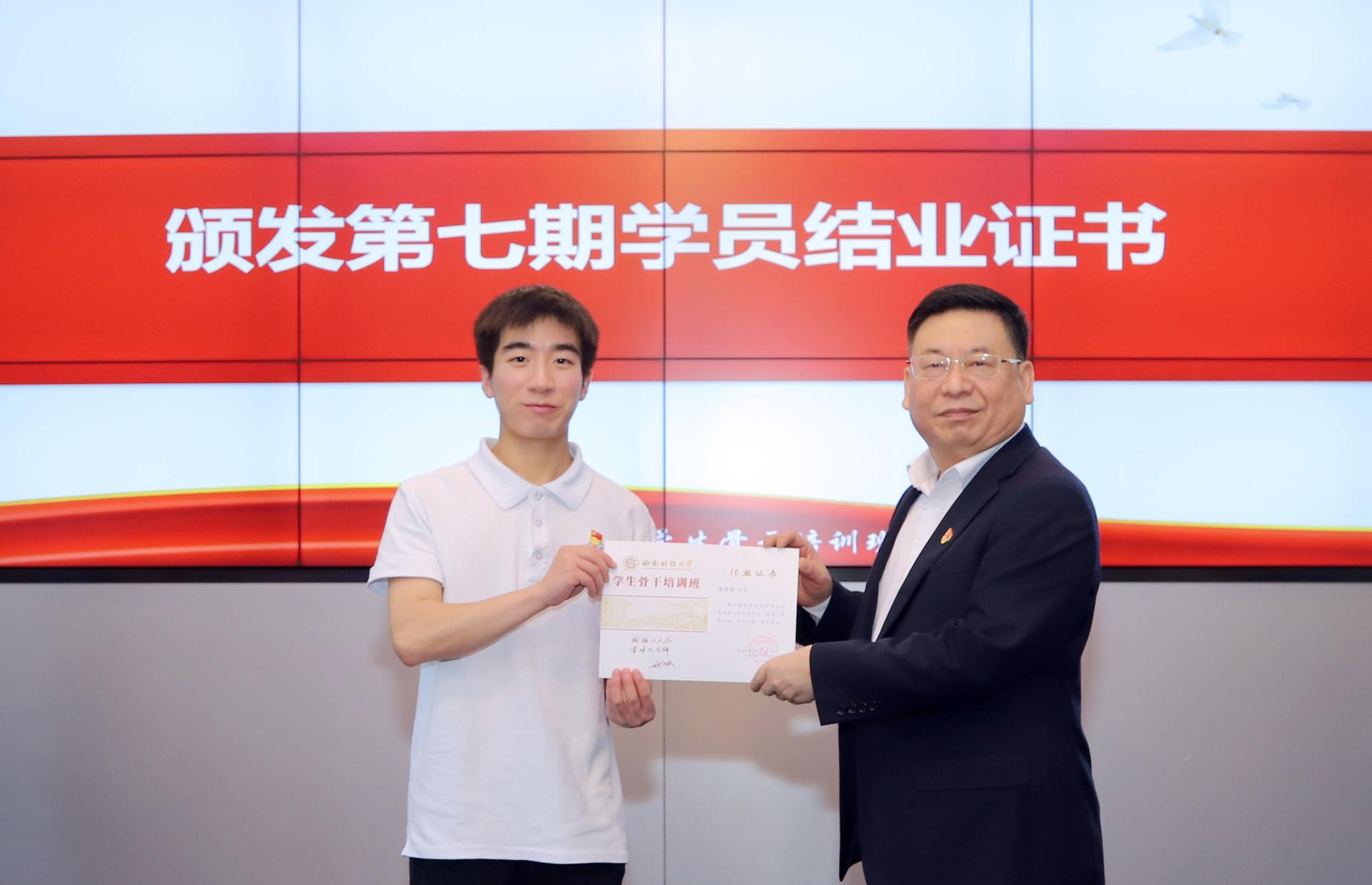 趙德武為第七期學(xué)員一一頒發(fā)結(jié)業(yè)證書并合影留念。他在與第七期學(xué)員的交談中對(duì)學(xué)員們表達(dá)了充分肯定和殷切期望,勉勵(lì)大家踔厲奮發(fā)、勇毅前進(jìn)、追求卓越。他強(qiáng)調(diào),希望學(xué)員們牢記“樹雄心大志,當(dāng)時(shí)代先鋒”的班訓(xùn),弘揚(yáng)“經(jīng)世濟(jì)民,孜孜以求”的大學(xué)精神,不負(fù)韶華,不負(fù)時(shí)代,不負(fù)人民,努力成為德智體美勞全面發(fā)展、堪當(dāng)民族復(fù)興重任的時(shí)代新人。