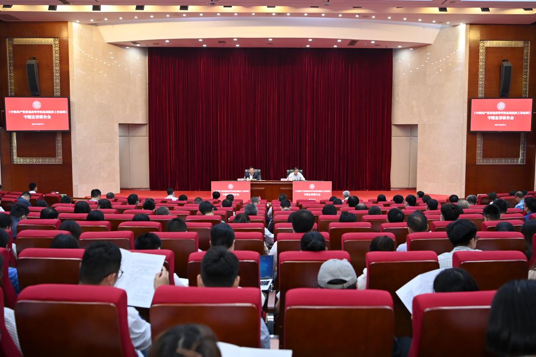 趙德武強調,本次修訂的《條例》,深入貫徹習近平新時代中國特色社會主義思想和黨的十九大、十九屆二中、三中、四中、五中全會精神,貫徹落實新時代黨的建設總要求和新時代黨的組織路線,堅持以黨章為根本依據,對高?;鶎狱h組織工作作出全面規范,體現了近年來高校黨建工作的理論、實踐和制度創新成果,是高校黨的建設實踐探索和制度建設的重要成果,是新時代高校黨的建設的基本遵循。《條例》的修訂和實施,事關高校黨建工作全局,意義重大、影響深遠,對于學校全面貫徹黨的教育方針,落實立德樹人根本任務,建設高質量教育體系,培養德智體美勞全面發展的社會主義建設者和接班人,具有重要意義。今年恰逢建黨百年的重大時刻,修訂頒布這項重要黨內法規,更具獨特而重要的意義。趙德武帶領參會人員逐條導學,重點圍繞“加強黨的政治建設”“黨的紀律檢查工作”“基層黨組織和黨員隊伍建設工作”“干部和人才工作”“思想政治工作”“落實黨建工作責任”等重大問題作了深入輔導和詳細解讀。